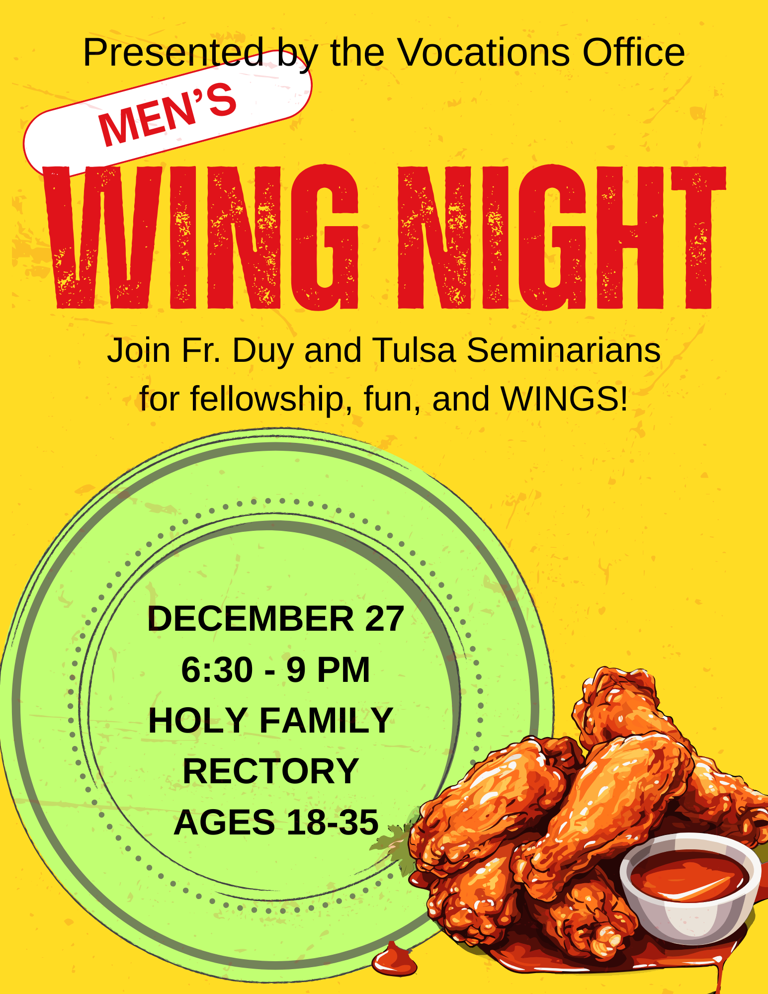 The Seminarians of the Diocese of Tulsa and Fr. Duy Nguyen, Vocations Director, are inviting men ages 18-35 for a night of fellowship, fun and wings!